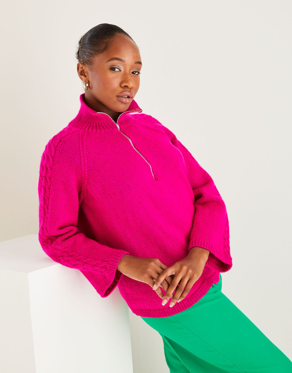 A Zip Neck Sweater featuring a cable stitch panel down the centre of both raglan sleeves which adds a subtly textured design detail and an interesting twist to this knitting pattern from our Mood-Boosting Brights collection.