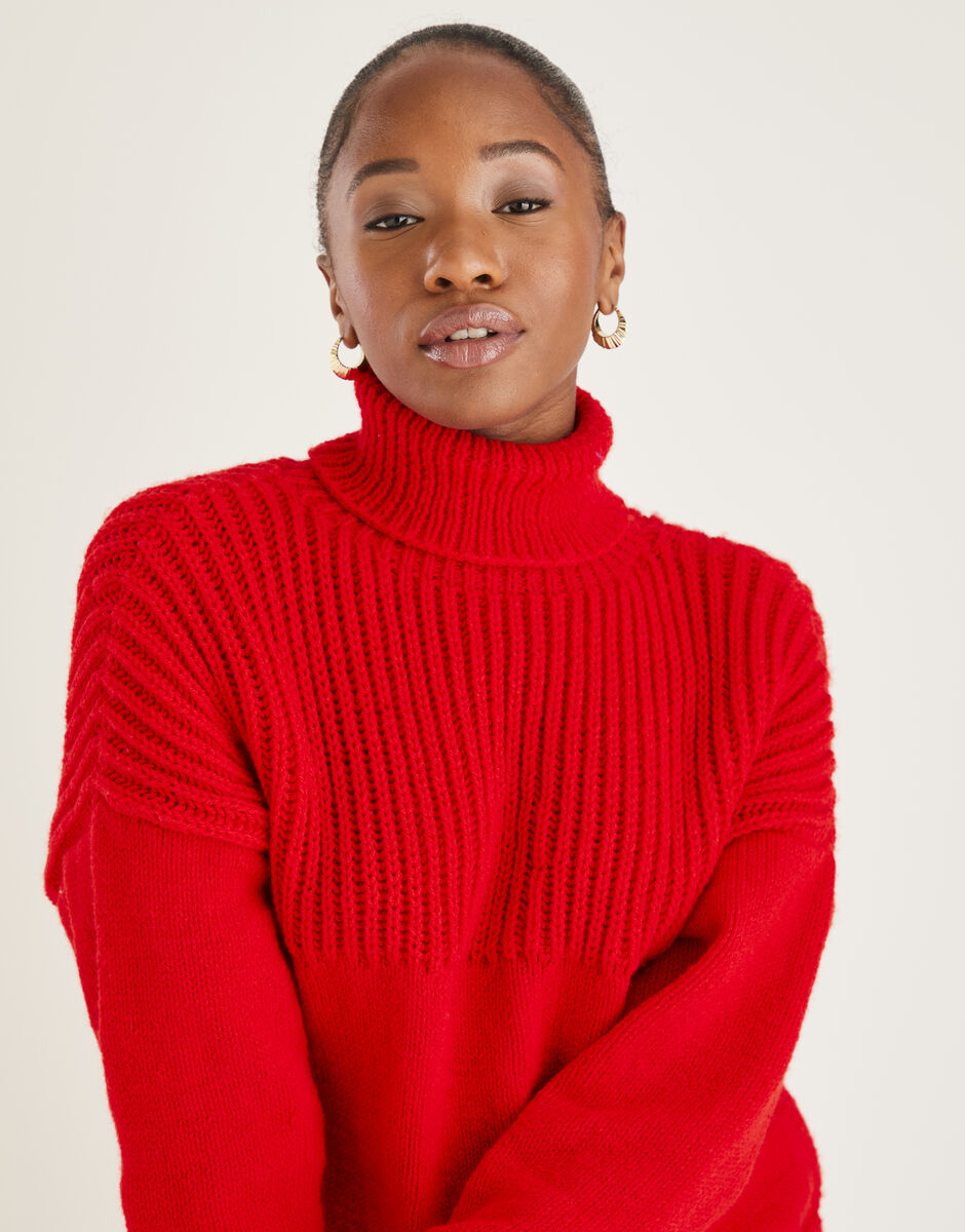 Contrasting Fisherman’s rib and stocking stitch add interest to this elegant Roll Neck Sweater from our Mood-Boosting Brights collection. The knitting pattern features simple drop shoulders and neat ribs to complete the cosy look, whichever colour you choose to make it in.