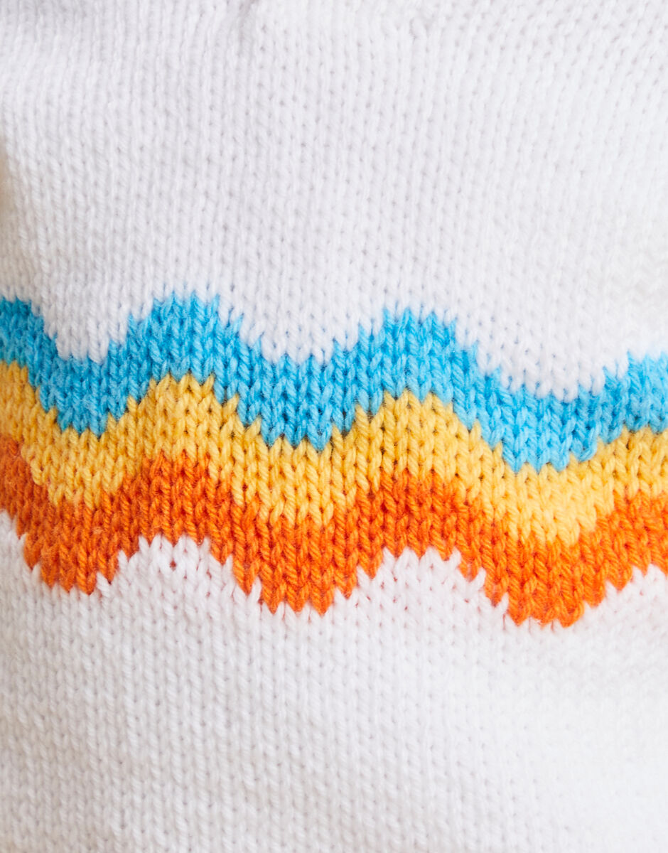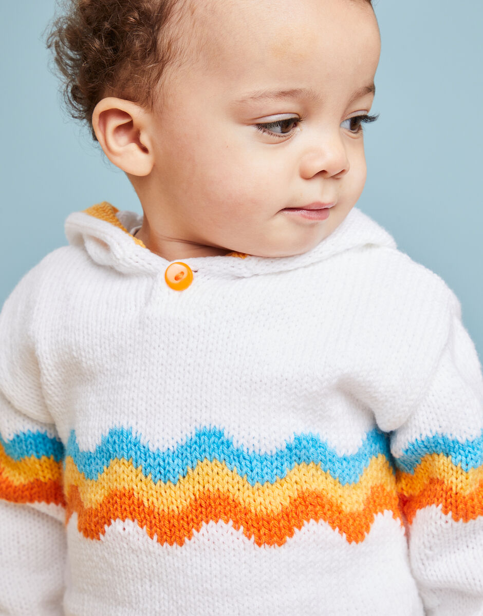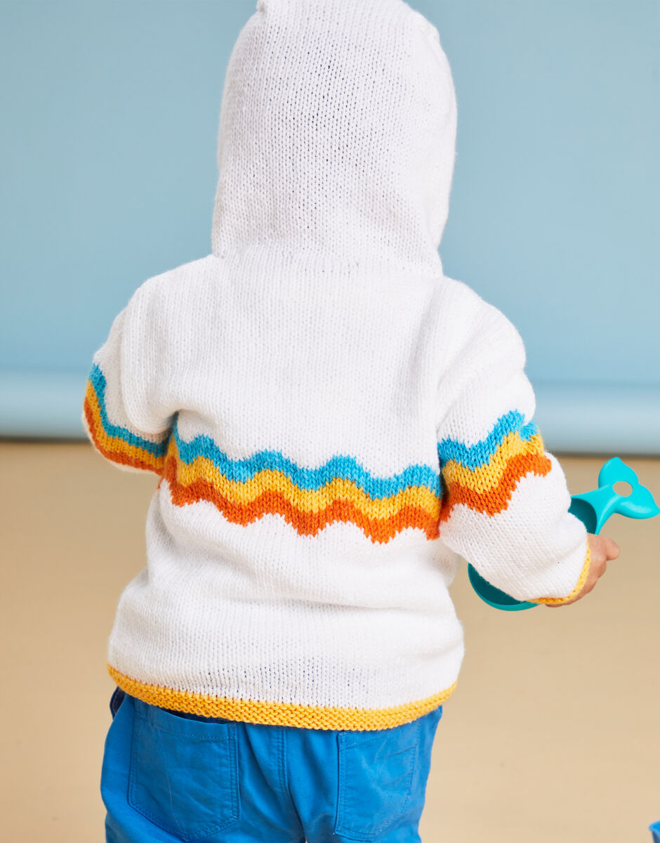 This knitting pattern includes the fair Isle technique which is used to create the waves on the body of this little hoodie. Tl complete your child’s Rainbow Wave Hoodie, you’ll knit garter stitch for the trims and add a button at the top for fastening.