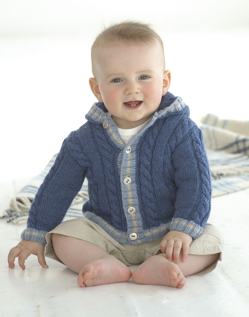 A super cosy hooded jacket with an all over cable pattern, knitted in Sirdar Snuggly DK. With the option of a collar or hood, and finished with a stripy rib trim, for babies and toddlers.