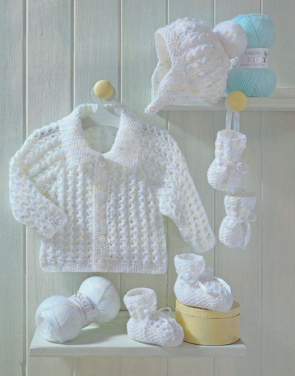 Baby knits to be treasured for years to come, this set includes a jacket, hat, bootees and mittens, all worked in our super soft Snuggly DK yarn. Ideal for premature babies through to two years old, this gorgeous set has a stunning textured stitch pattern with eyelets across all four styles.