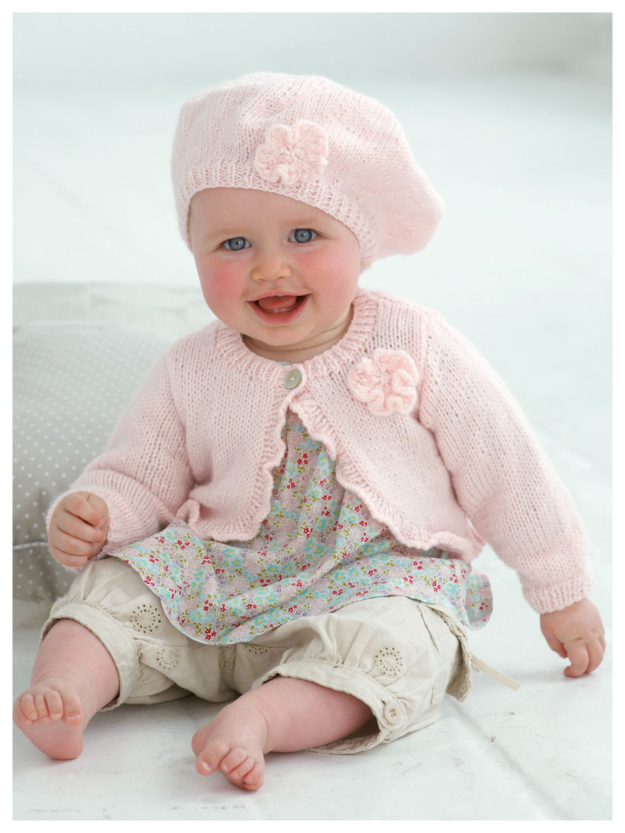 A beautiful beret and cardigan set knitted in stocking stitch with a delicate flower motif. Choose your favourite colour from our Snuggly palette. Our...