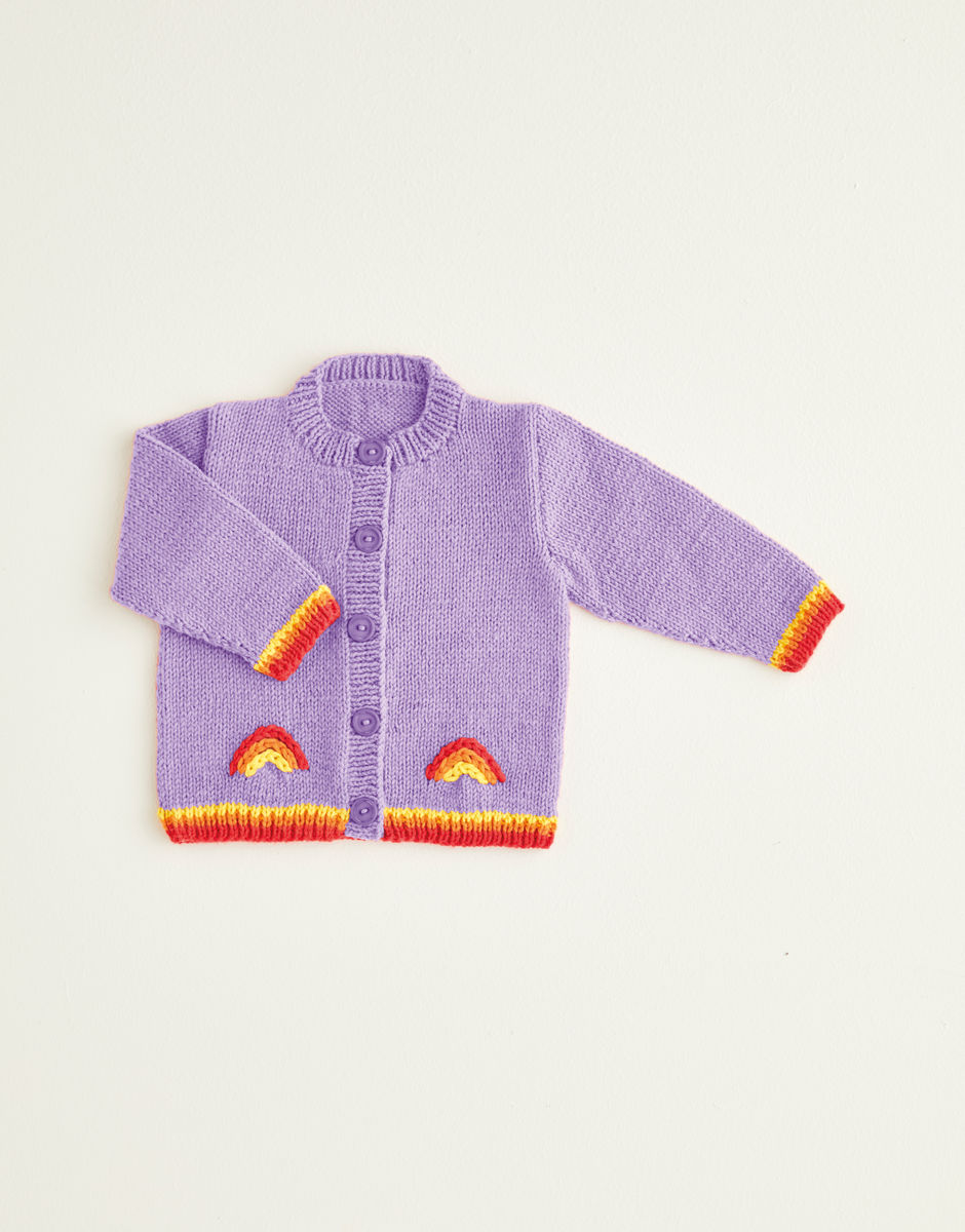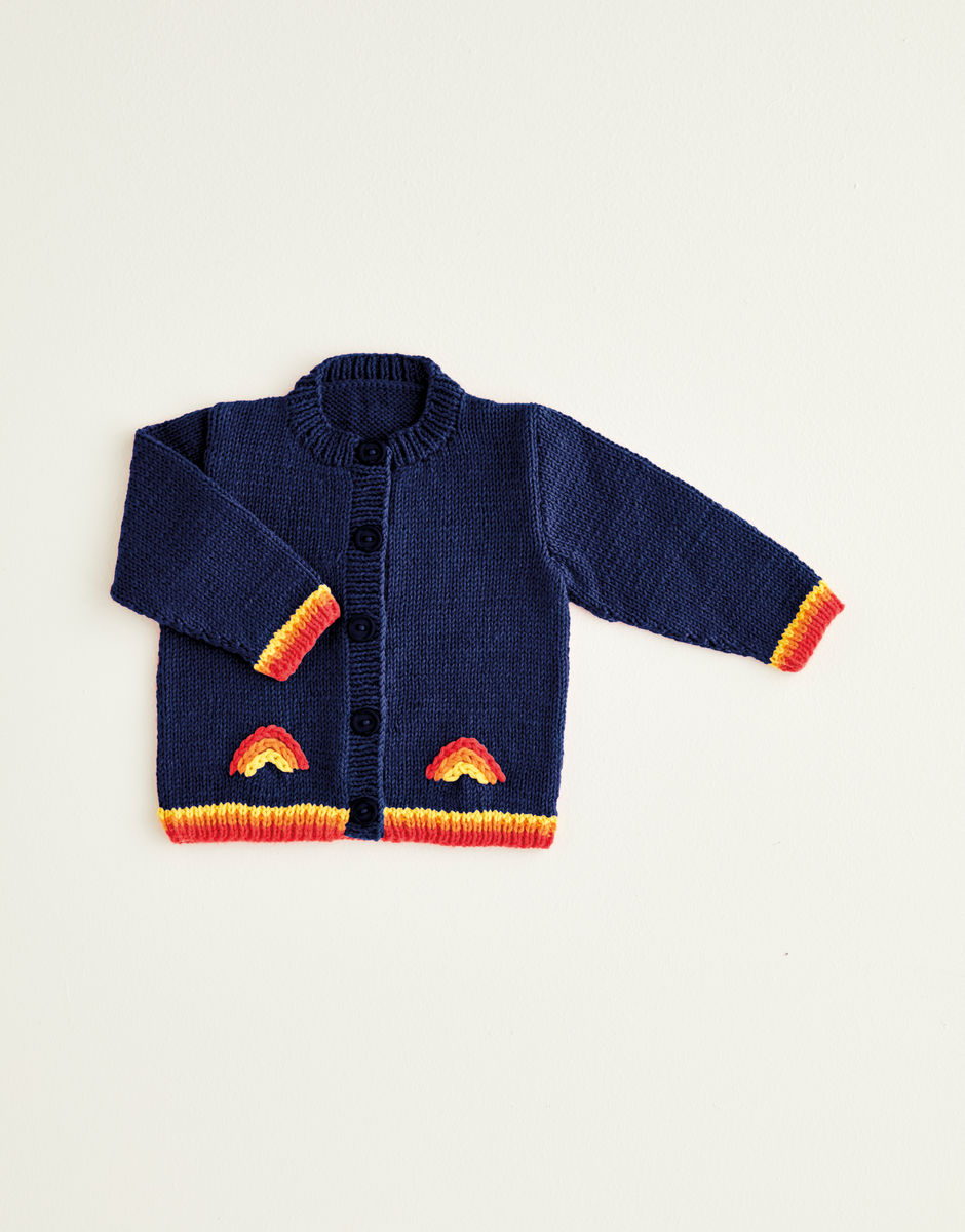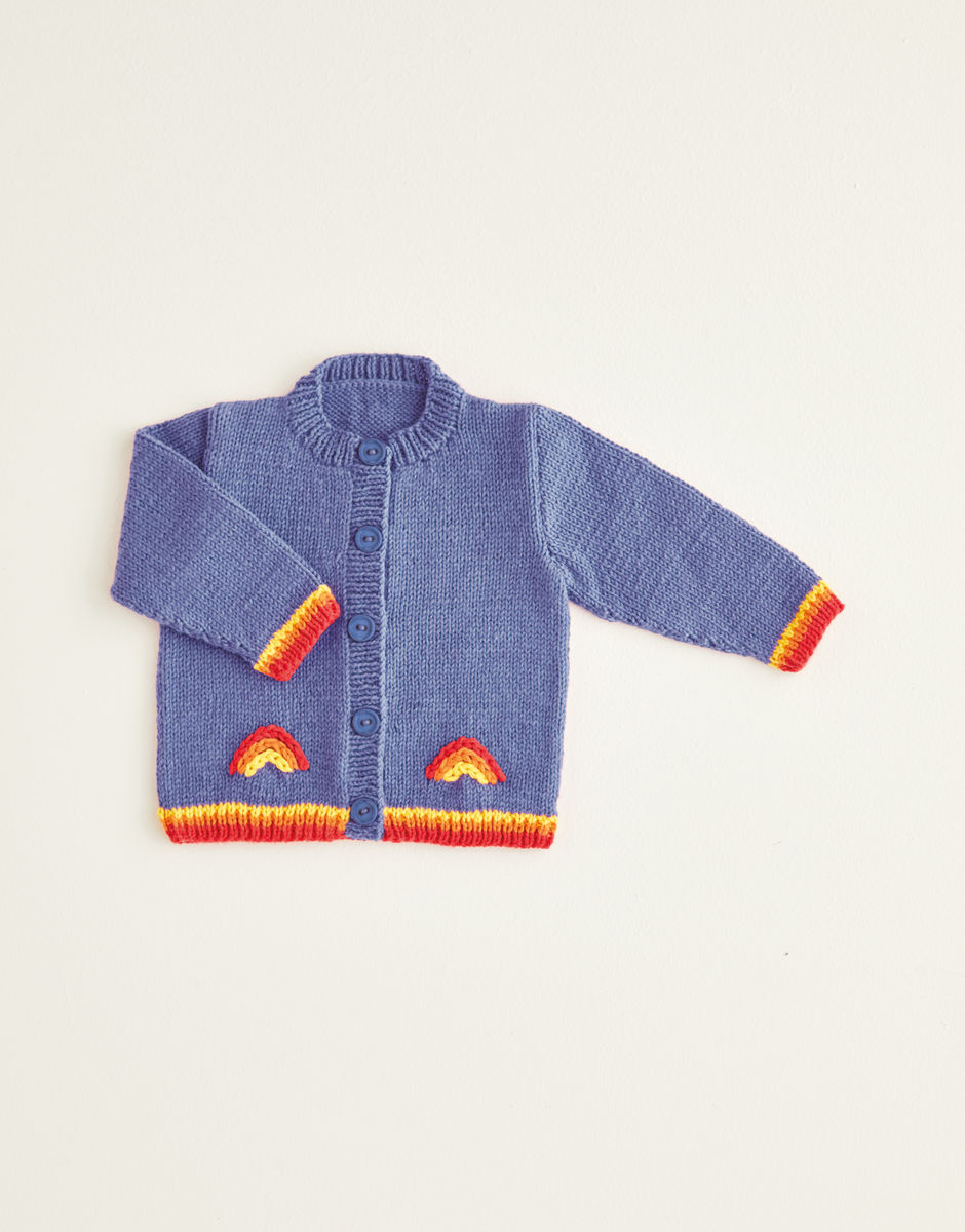 Isn’t every day better when there's a rainbow? That’s the inspiring thought behind our cute rainbow dungarees and co-ordinating jacket finished with bright rainbow striped trims. To keep these fun knits simple, you can swiss darn the baby-friendly fringed rainbow motifs. Knitting level: Easy You will also need: 1 Pair of 4mm (UK8 – USA6) Knitting Needles and 1 Pair of 3.25mm (UK10 – USA3) Knitting Needles. Stitch Holders. 5 [5:5:6:6:6] buttons for jacket, 2 buttons for dungarees.