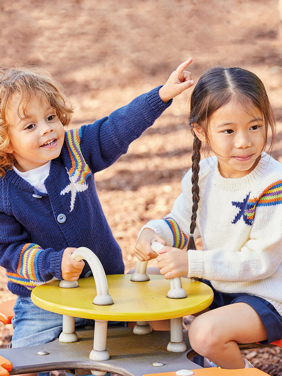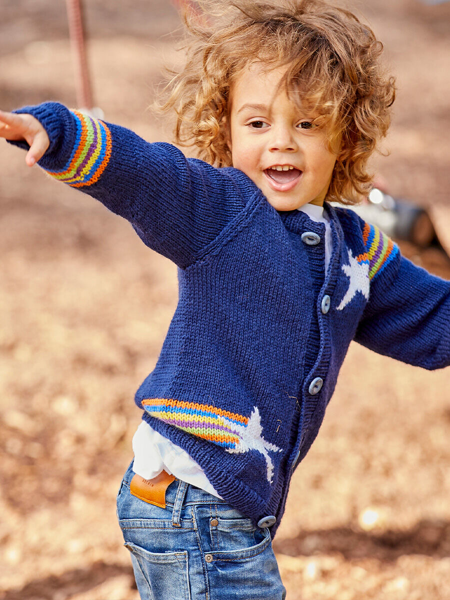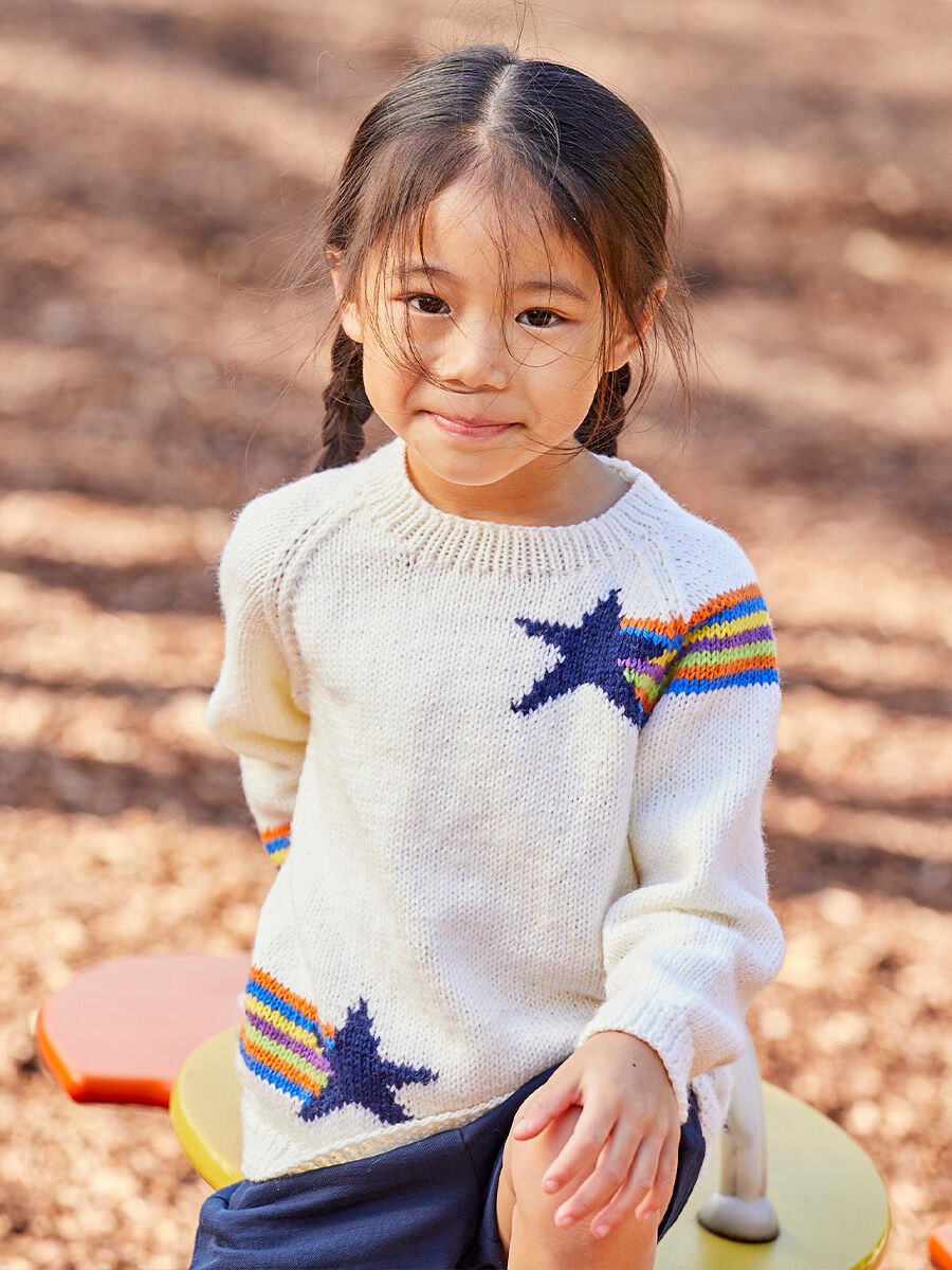 Inspire your little ones to shoot for the stars with this star sweater and cardigan in Snuggly DK. The bold colourful stripes and star intarsia on the shoulder and cuffs add a little splash of colour to brighten up any day.