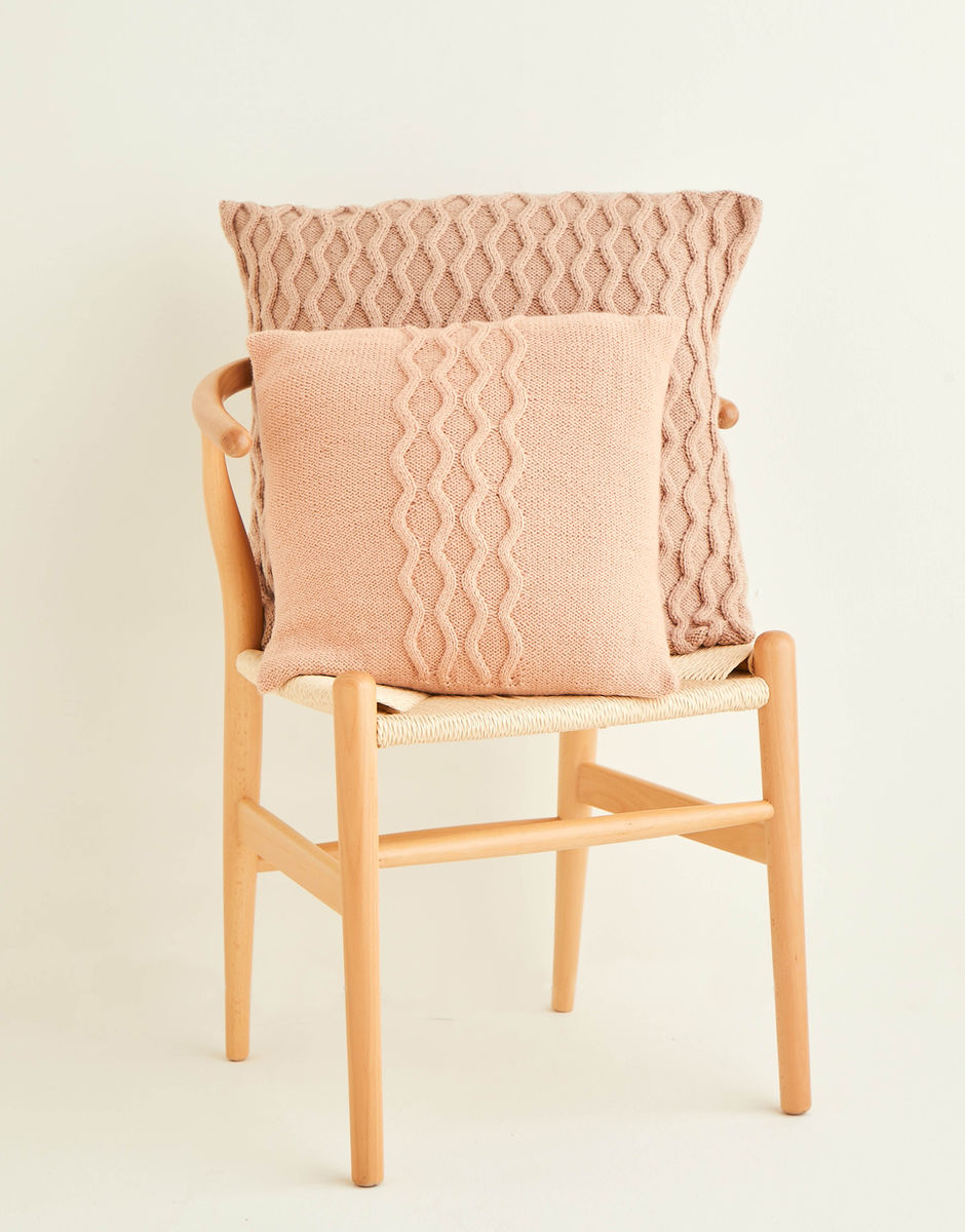 Add a new stitch to your repertoire as well as your sofa with these Zig Zag Cable Cushions. Knit them in soothing shades like the ones we’ve chosen or, with 100 Hayfield Bonus DK colours to choose from, cast on the ones that suit your home best. Knitting level: Intermediate You will also need: 1 Pair of 4mm (UK8 – USA6) Knitting Needles. Cable needle. 1 55 x 55cm, (21¾ x 21¾in) washable cushion pad for cabled cushion. 1 40 x 40cm, (15¾ x 15¾in) washable cushion pad for cabled panel cushion.