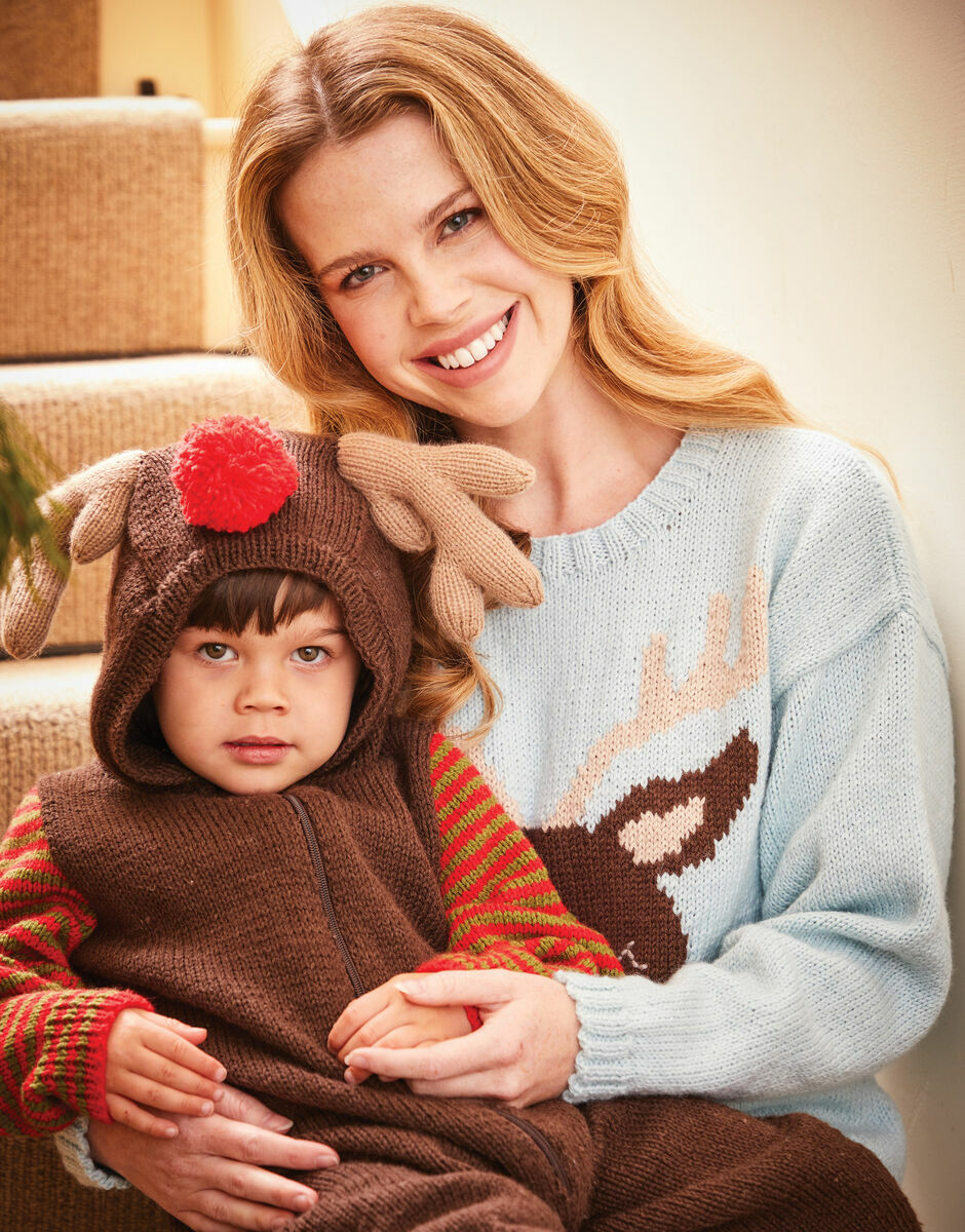 A cosy character onesie for the festive season, this Little Reindeer onesie is a surprisingly easy Christmas knitting pattern.