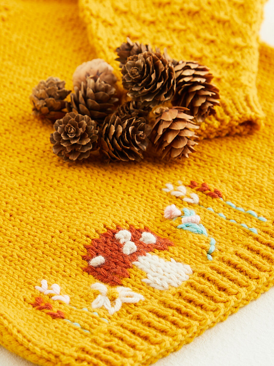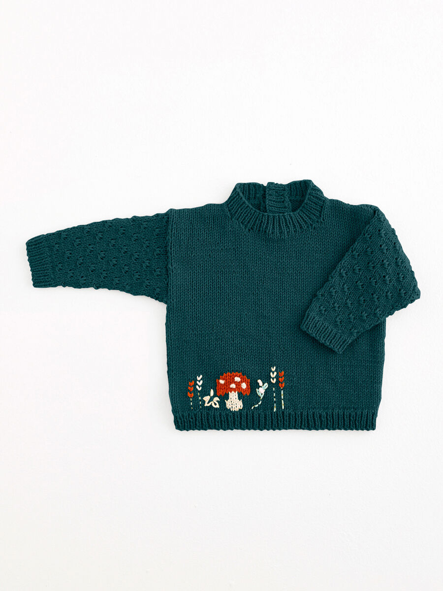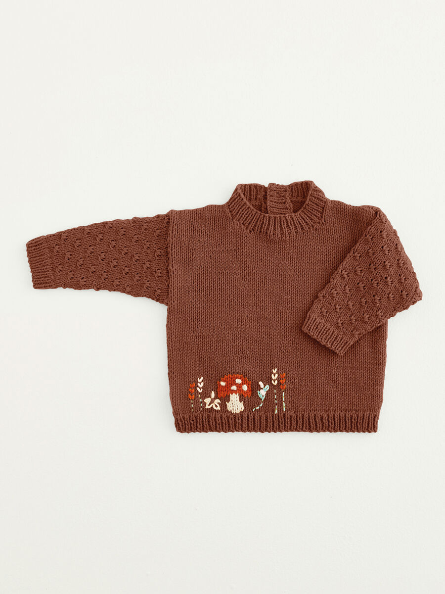 Knit this pretty little outfit in simple stocking stitch, add knot stitch to create a bark-like texture on the sleeves and trim the set with a basic rib. The trousers have a gusset and shaping to easily accommodate a nappy and you'll knit an i-cord to create the drawstring waist. Swiss darn woodland flowers and the spots onto your intarsia toad stool to finish this fun project for you and your baby.