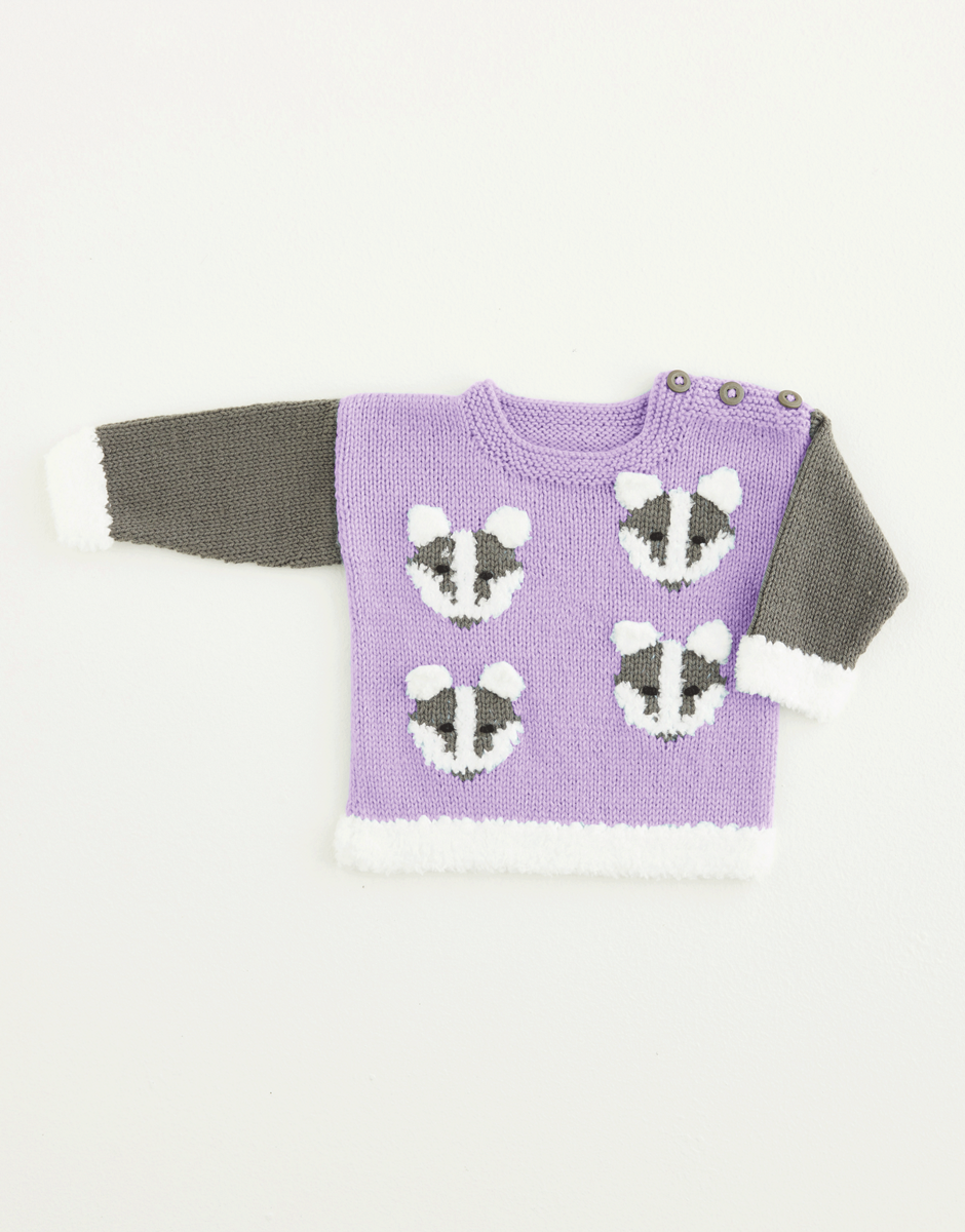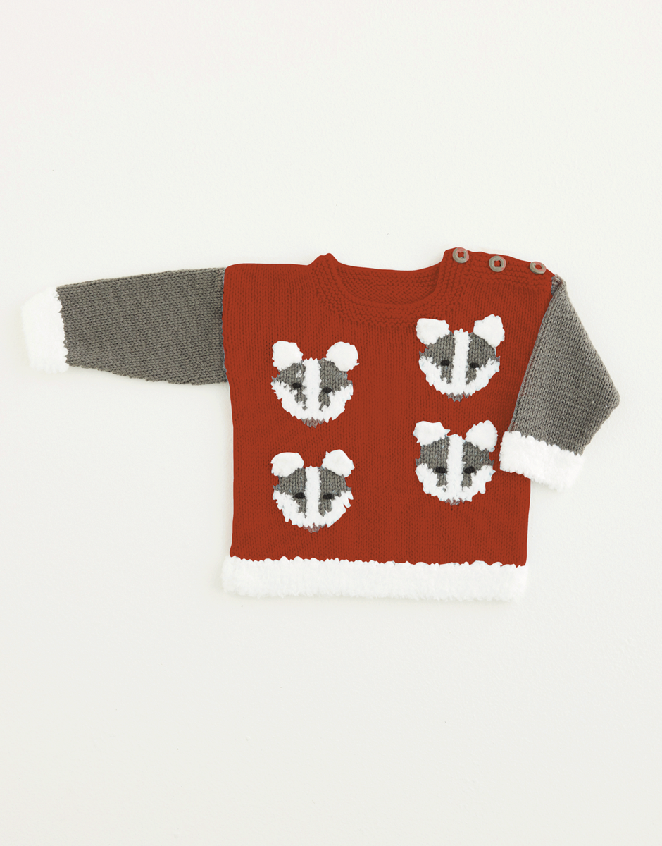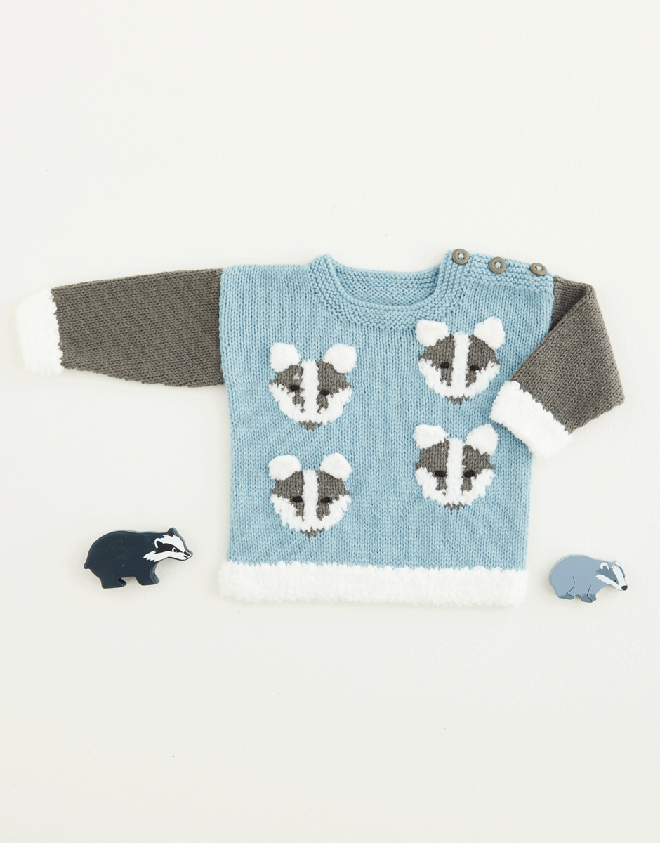 Fluffy little forest friends who won't get lost on a Walk In The Woods. This cute sweater has a quartet of baby badgers swiss darned on the front. Combine Snuggly DK, Britain's favourite baby yarn, with Snuggly Bunny, probably the cutest, to trim this striking knit in high contrast shades to keep your little ones entertained as well as cosy.