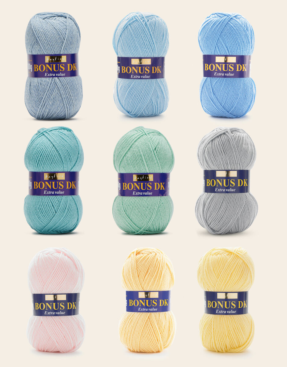 1 x Hayfield Bonus DK Sky Marl 1 x Hayfield Bonus DK Powder Blue 1 x Hayfield Bonus DK Bluebell 1 x Hayfield Bonus DK Lagoon Blue 1 x Hayfield Bonus DK Gentle Jade 1 x Hayfield Bonus DK Silver Mist 1 x Hayfield Bonus DK Peaches 1 x Hayfield Bonus DK Lemon 1 x Hayfield Bonus DK Primrose