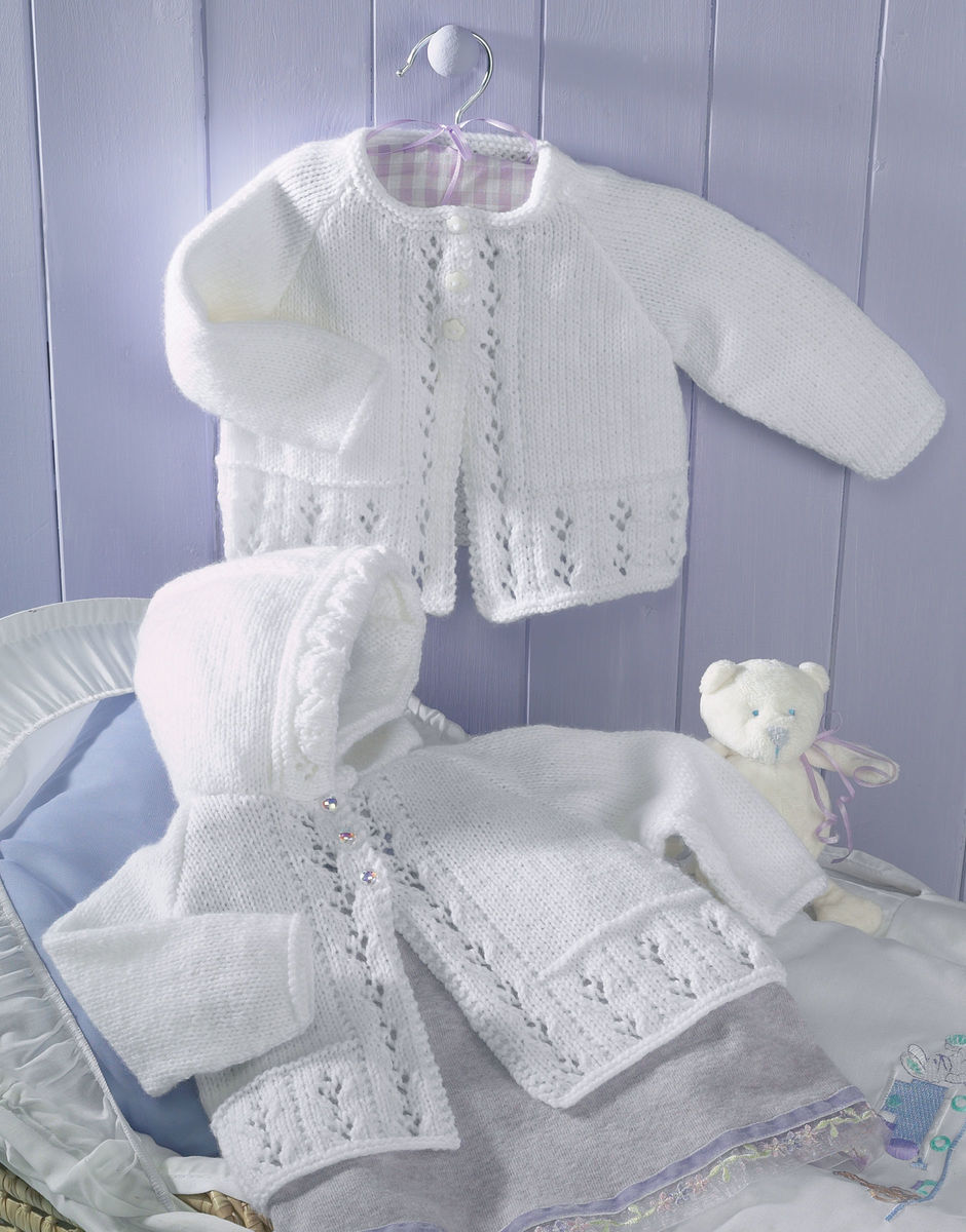 With a stunning lacey trim, this matinee coat can be knitted with or without the trimmed hood. Using stocking stitch with raglan details, this pattern can be made for ages from newborn to two years.