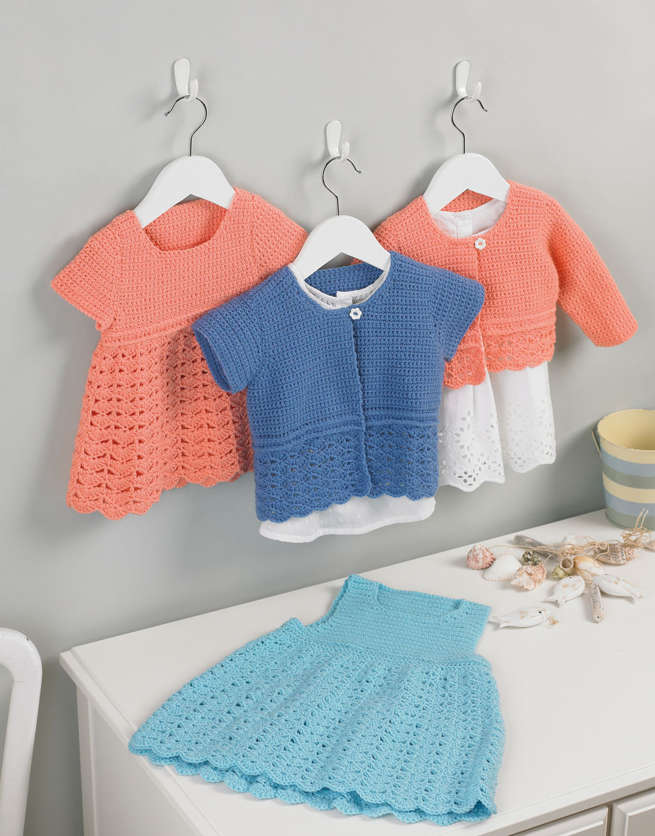 Beautiful lace panels bring this collection of dresses and cardigans together. With the option of a long or short sleeved cardigan and a pinafore or dress, you can create a gorgeous outfit for your little one. With a huge range of colours with instructions for sizes from our super soft Snuggly DK yarn, you will be spoilt for choice. All these pieces can be made for ages from newborn to two years.