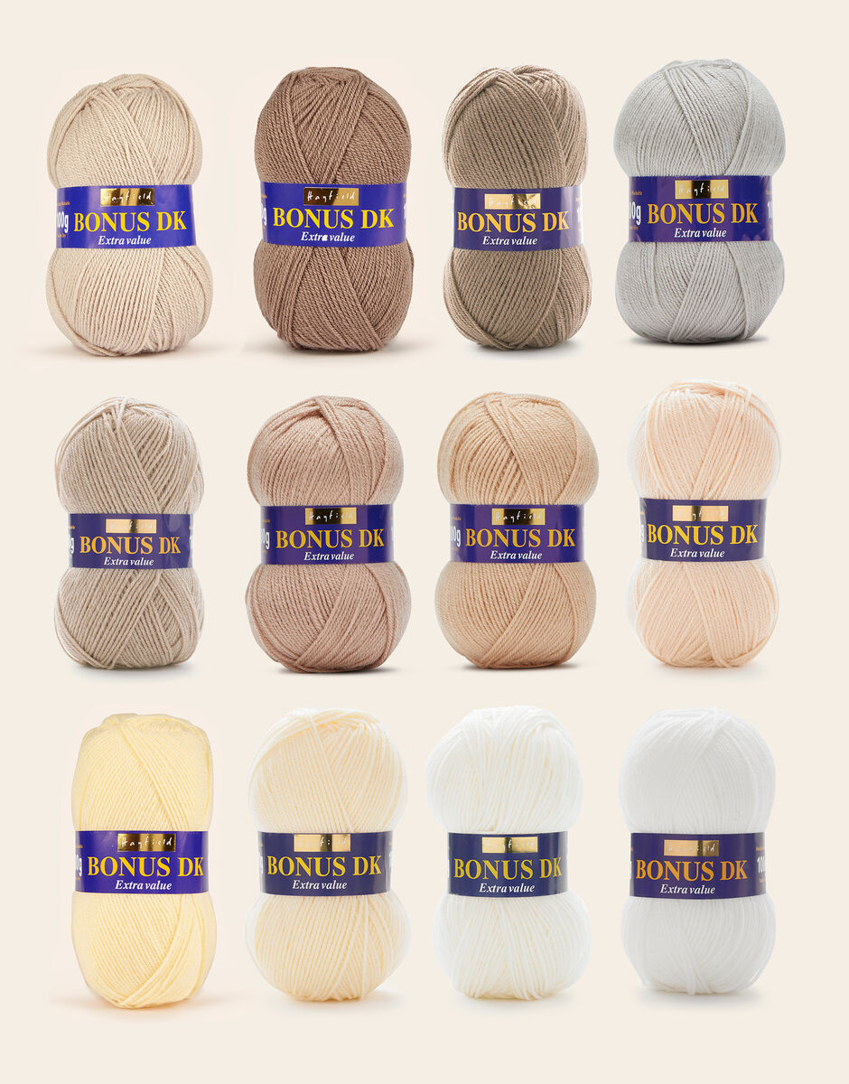 1 x Hayfield Bonus DK Moon 1 x Hayfield Bonus DK Fawn 1 x Hayfield Bonus DK Walnut 1 x Hayfield Bonus DK Pearl Grey 1 x Hayfield Bonus DK Oatmeal 1 x Hayfield Bonus DK Mink 1 x Hayfield Bonus DK Champagne 1 x Hayfield Bonus DK Biscuit 1 x Hayfield Bonus DK Birch 1 x Hayfield Bonus DK Aran 1 x Hayfield Bonus DK Cream 1 x Hayfield Bonus DK White