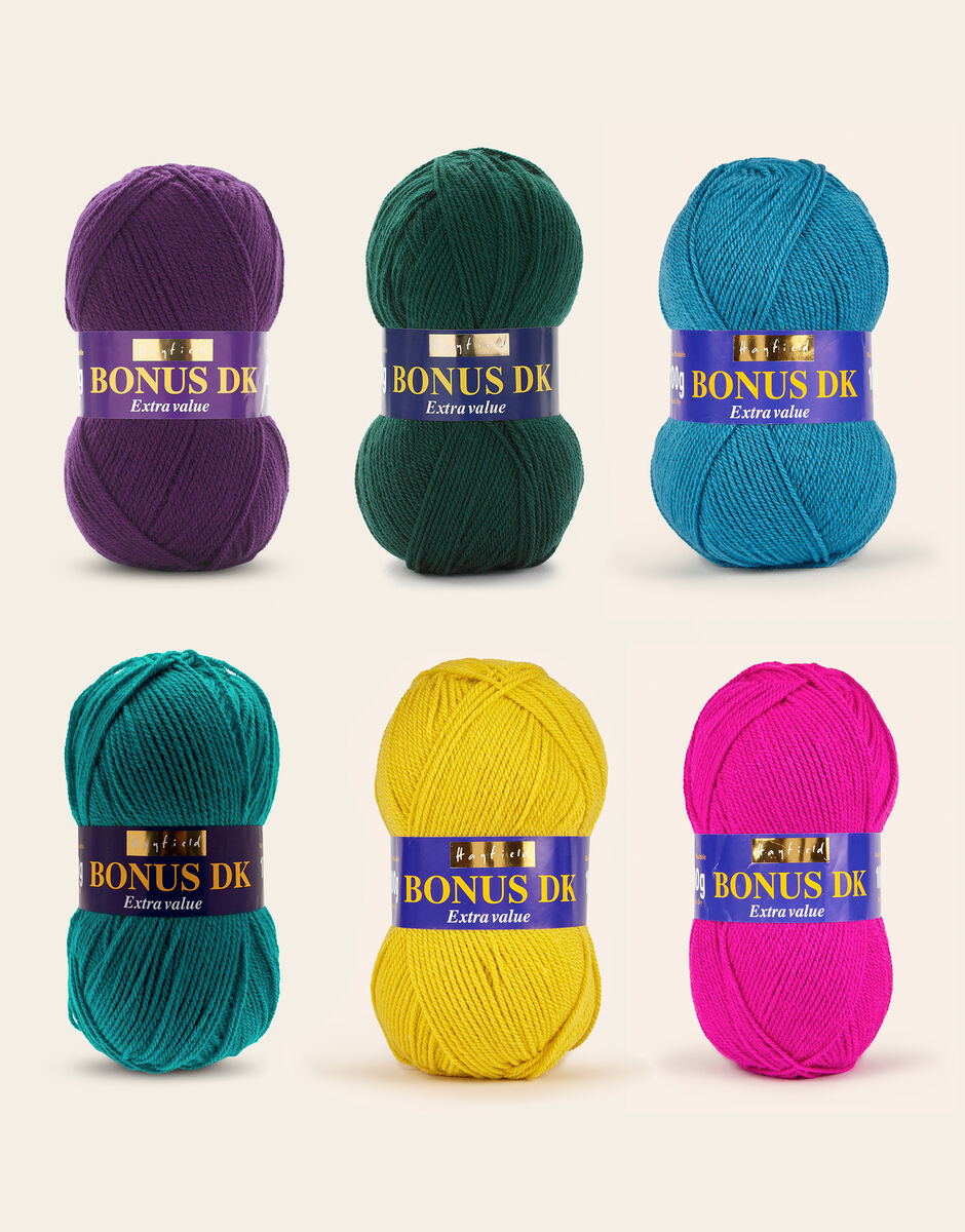 1 x Hayfield Bonus DK Purple 1 x Hayfield Bonus DK Bottle Green 1 x Hayfield Bonus DK Peacock 1 x Hayfield Bonus DK Rainforest 1 x Hayfield Bonus DK Gilt 1 x Hayfield Bonus DK Magenta