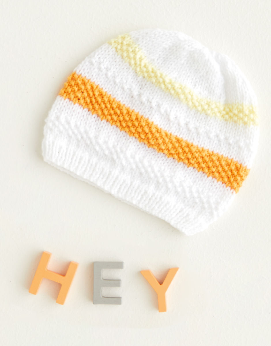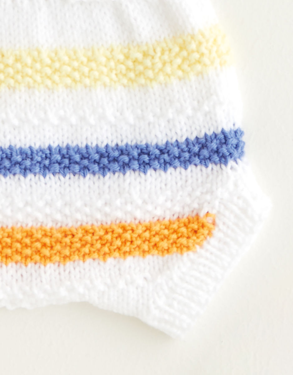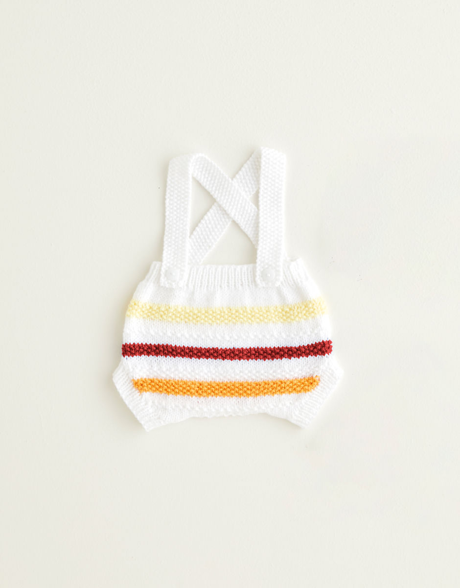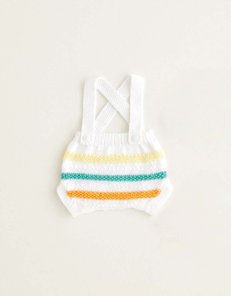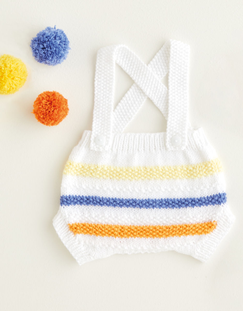 Featuring sunny, rainbow-inspired stripes, this dungaree style romper with button fastening has snug ribs to keep baby’s nappy under wraps. Pop on the matching beanie hat and booties for overall cuteness and enjoy all the 'oohs' and 'aahs'. Knitting level: Intermediate You will also need: Pair of 4mm (UK8 – USA6) Knitting Needles, 1 Pair of 3.25mm (UK10 – USA3) Knitting Needles and Stitch Holders. 2 buttons for romper, 2 buttons for booties.