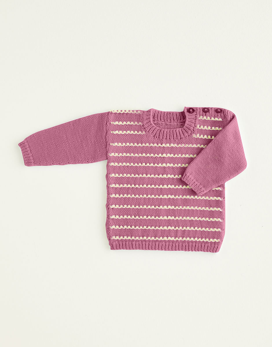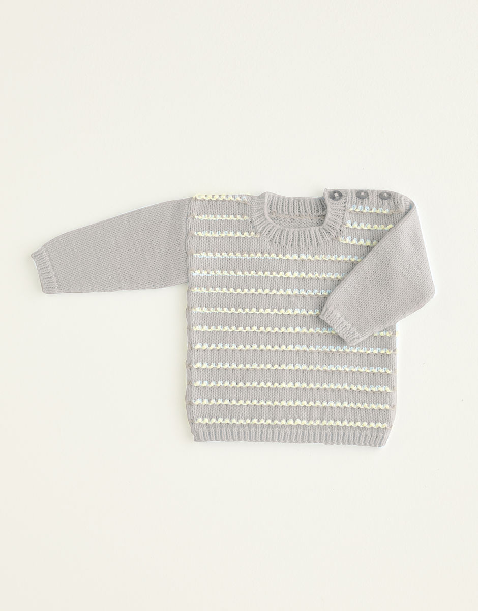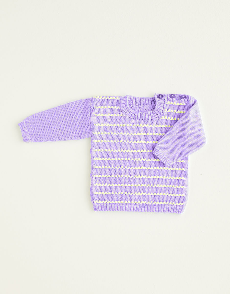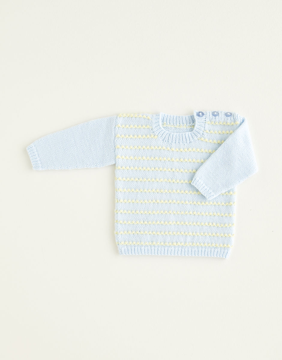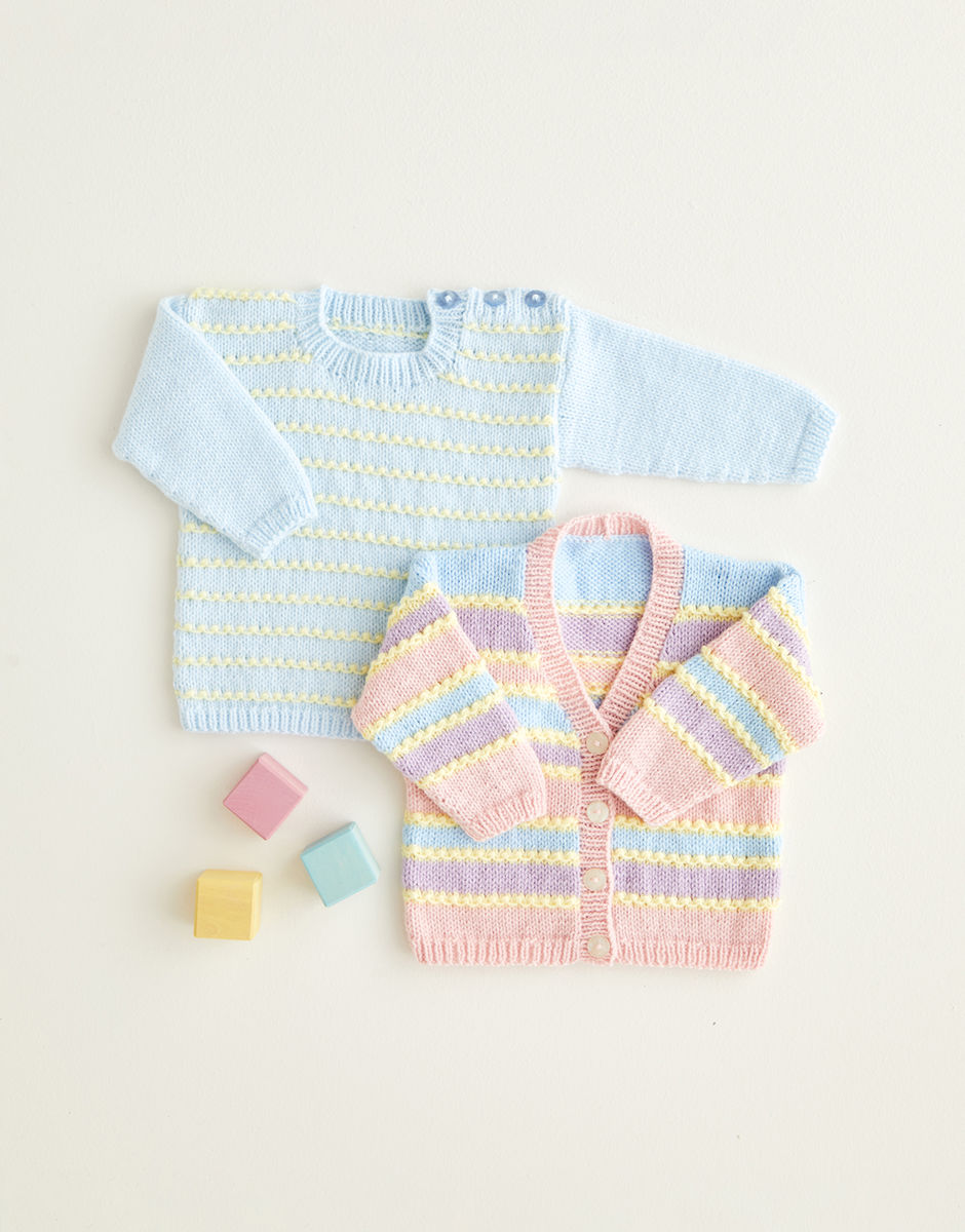 Sweet pastel knits inspired by gentle rainbow stripes and cloudless skies. A versatile round-neck sweater and v-neck cardigan in soft Snuggly DK make great everyday wear for babies, toddlers, and the crawling stages in between. Knitting level: Intermediate You will also need: 1 Pair of 4mm (UK8 – USA6) Knitting Needles, 1 Pair of 3.25mm (UK10 – USA3) Knitting Needles and Stitch Holder. 4 [4:4:5:5:5] buttons for cardigan, 3 buttons for sweater.